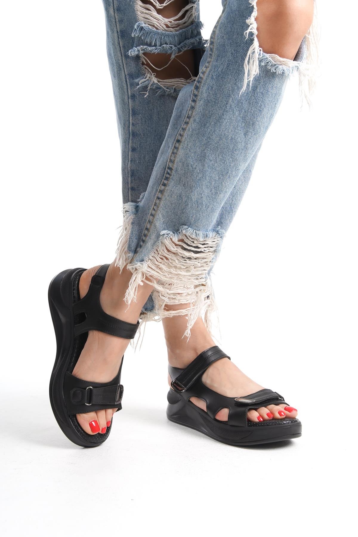 Kadın Aston Konfor Ortopedik Taban Cırtlı Sandalet  Siyah