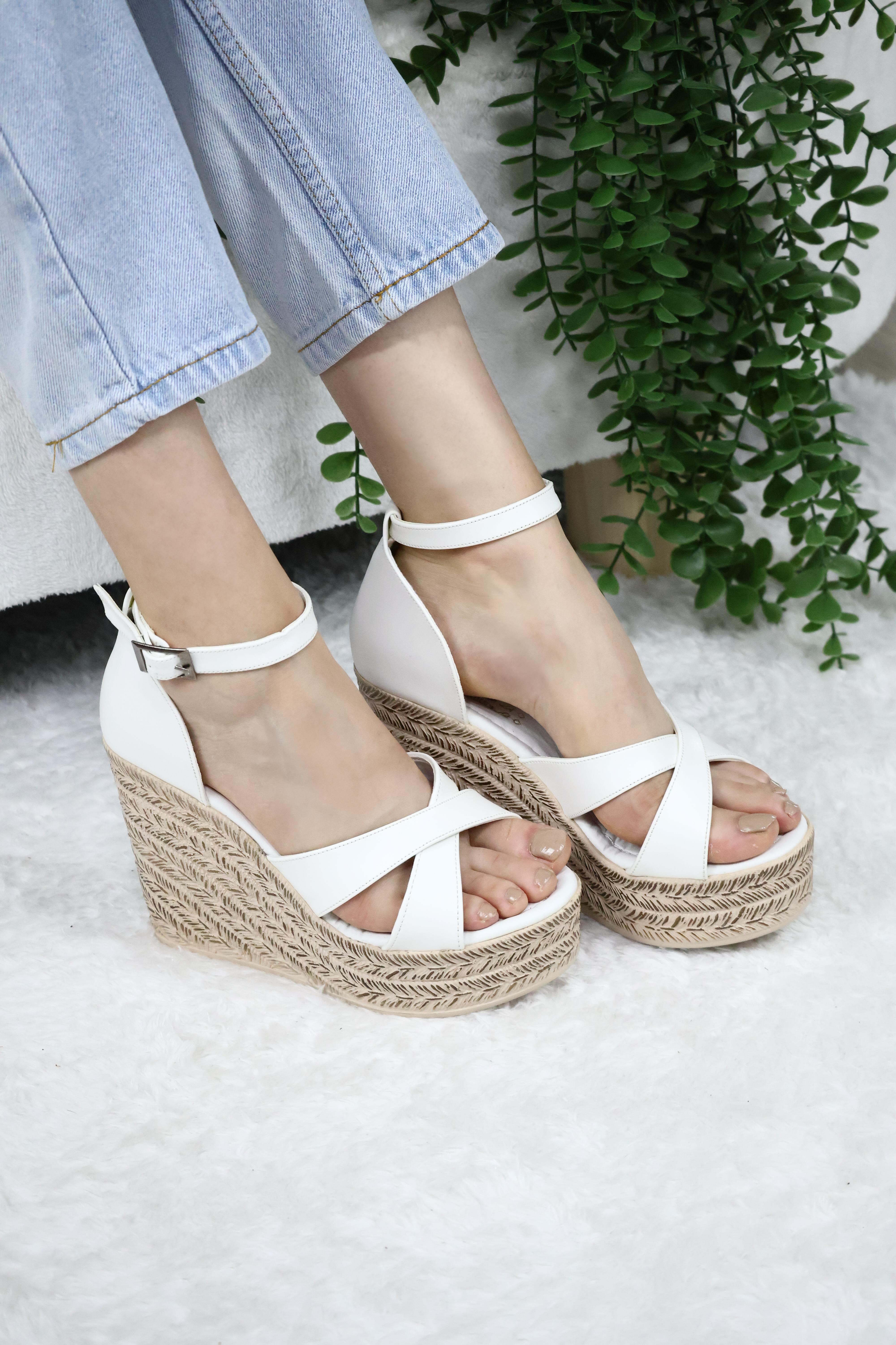 Kadın Çapraz Bantlı Dolgu Topuklu (11cm) Ayakkabı Rahat Yüksek Topuklu 700 Beyaz