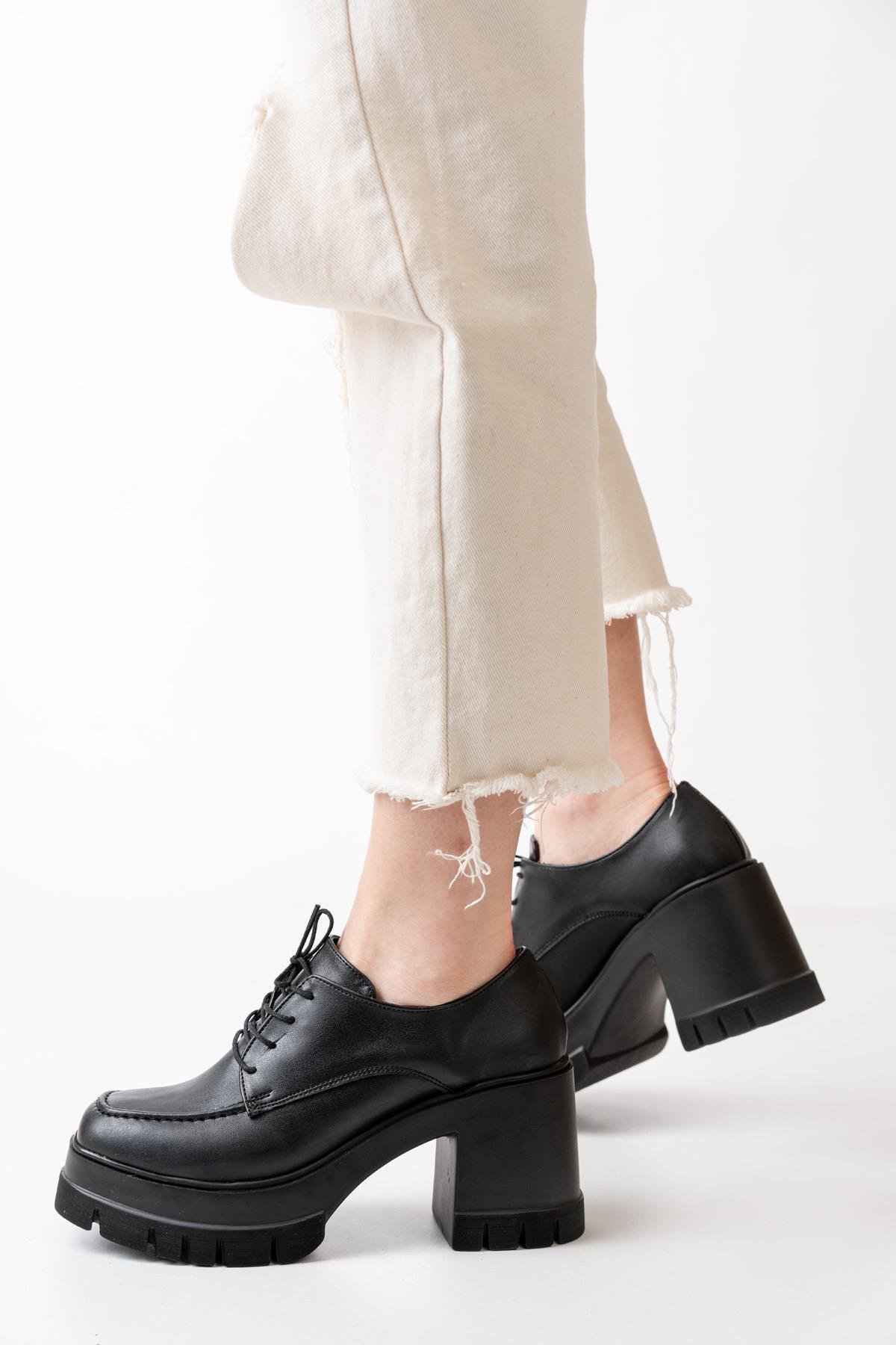 Kadın Cilt Siyah Bağcıklı 8 cm Topuklu Platformlu Ayakkabı siyah