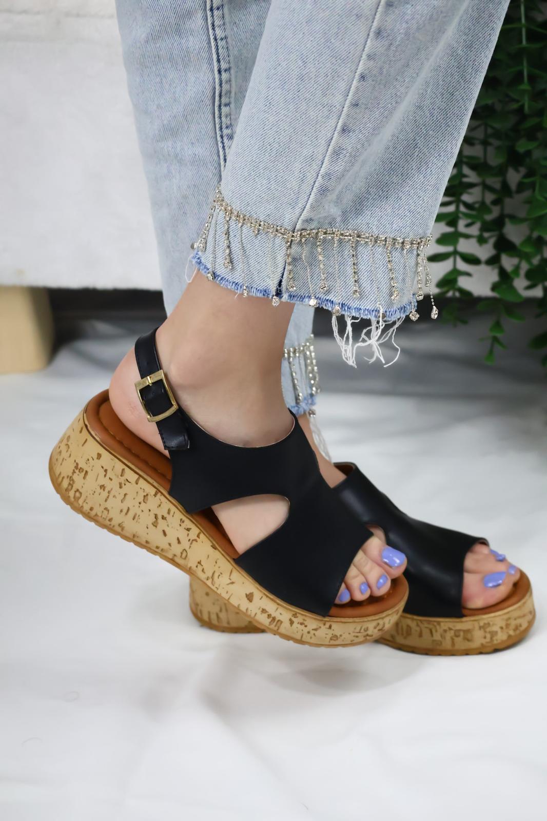 Kadın Elena Mantar Taban Ortopedik Sandelet  Siyah