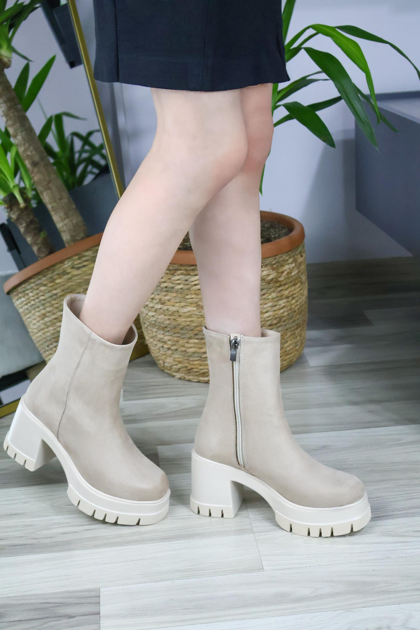 Kadın Leysi 8 Cm Platformlu Topuklu Fermuarlı Bot Bej Süet