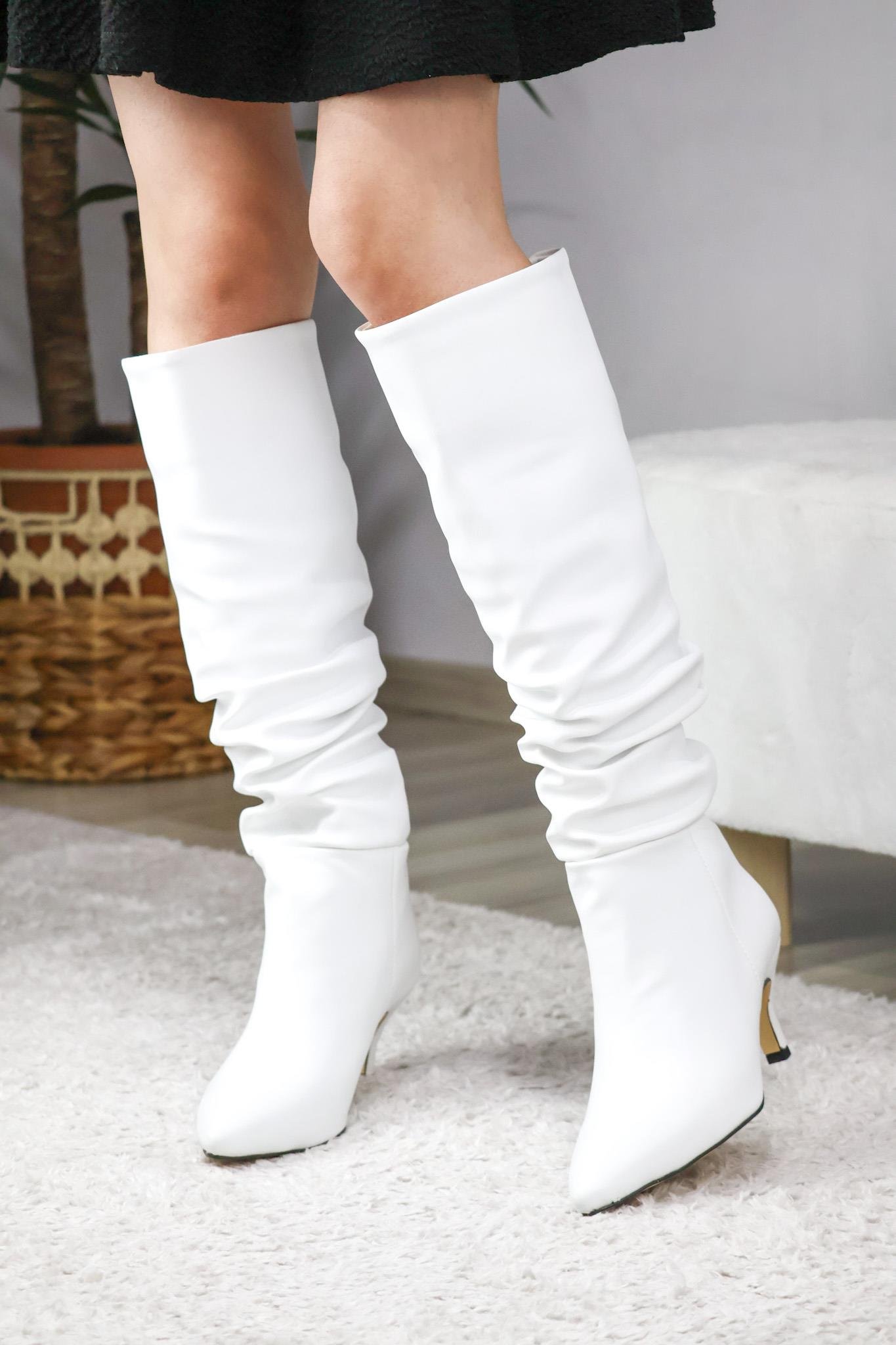 Kadın OSLO Topuklu Büzgülü Şık Tarz Günlük Rahat Çizme Beyaz