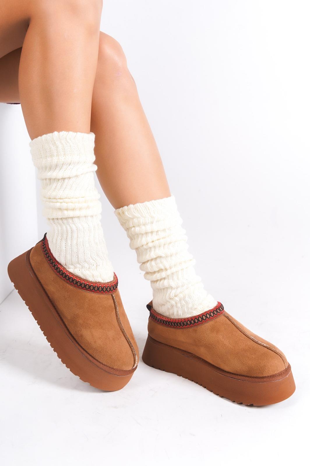 Kadın Rose İçi Tüylü Düz Taban Ayakkabı - Yarım Bot Taba