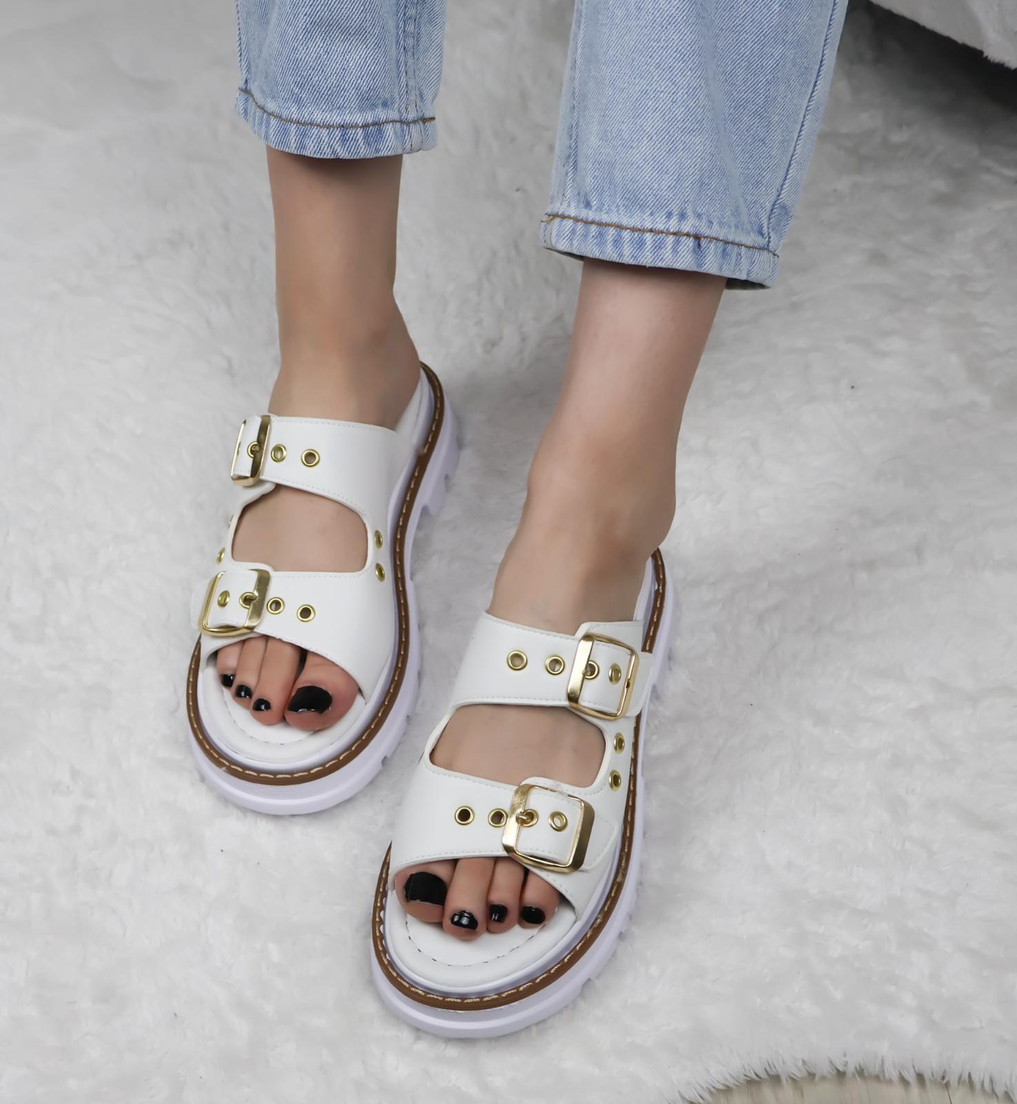 Kadın Çift Bant Kapsül Detaylı Kalın Taban Ortopedik Terlik Beyaz