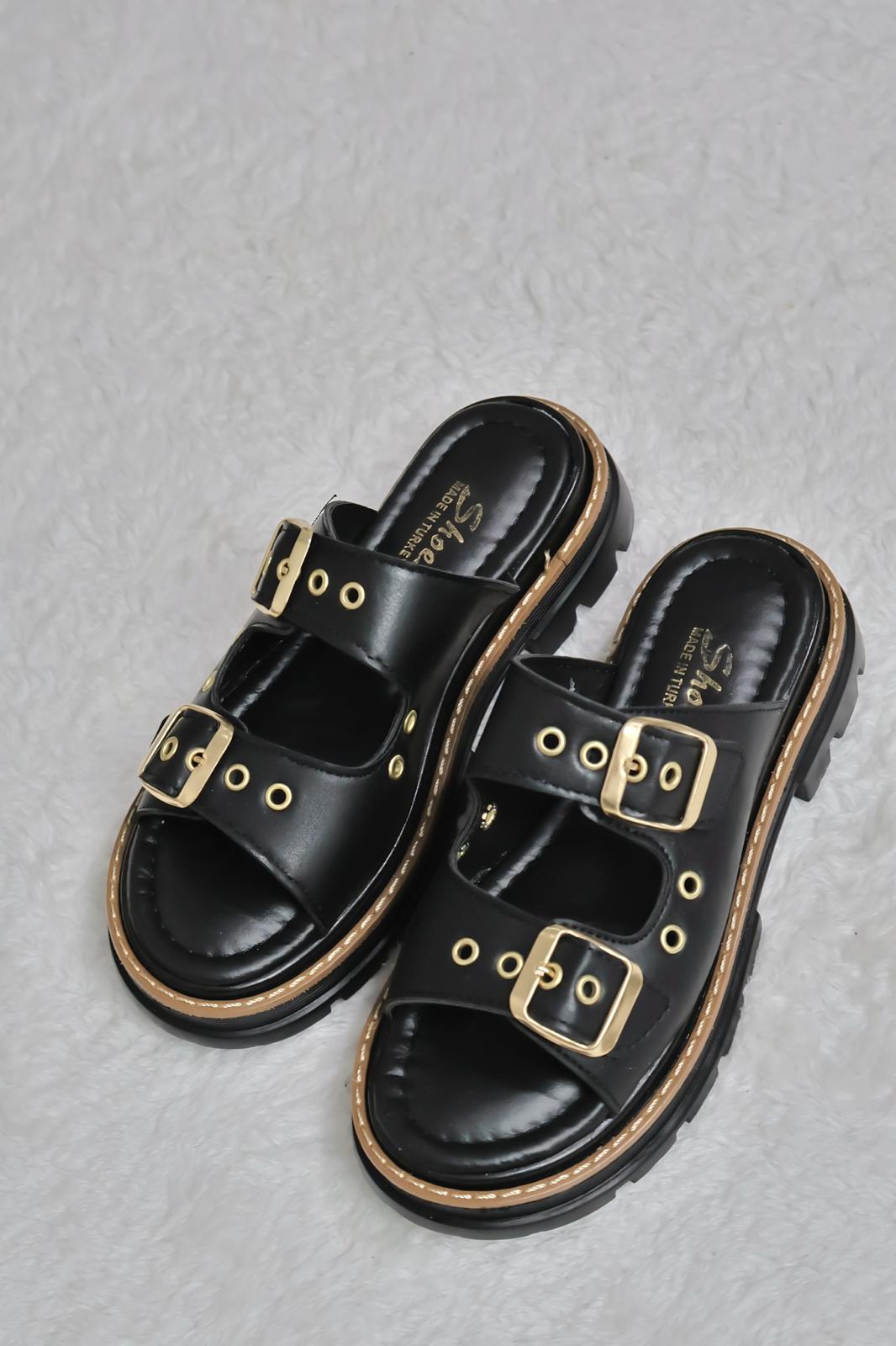 Kadın Çift Bant Kapsül Detaylı Kalın Taban Ortopedik Terlik Siyah