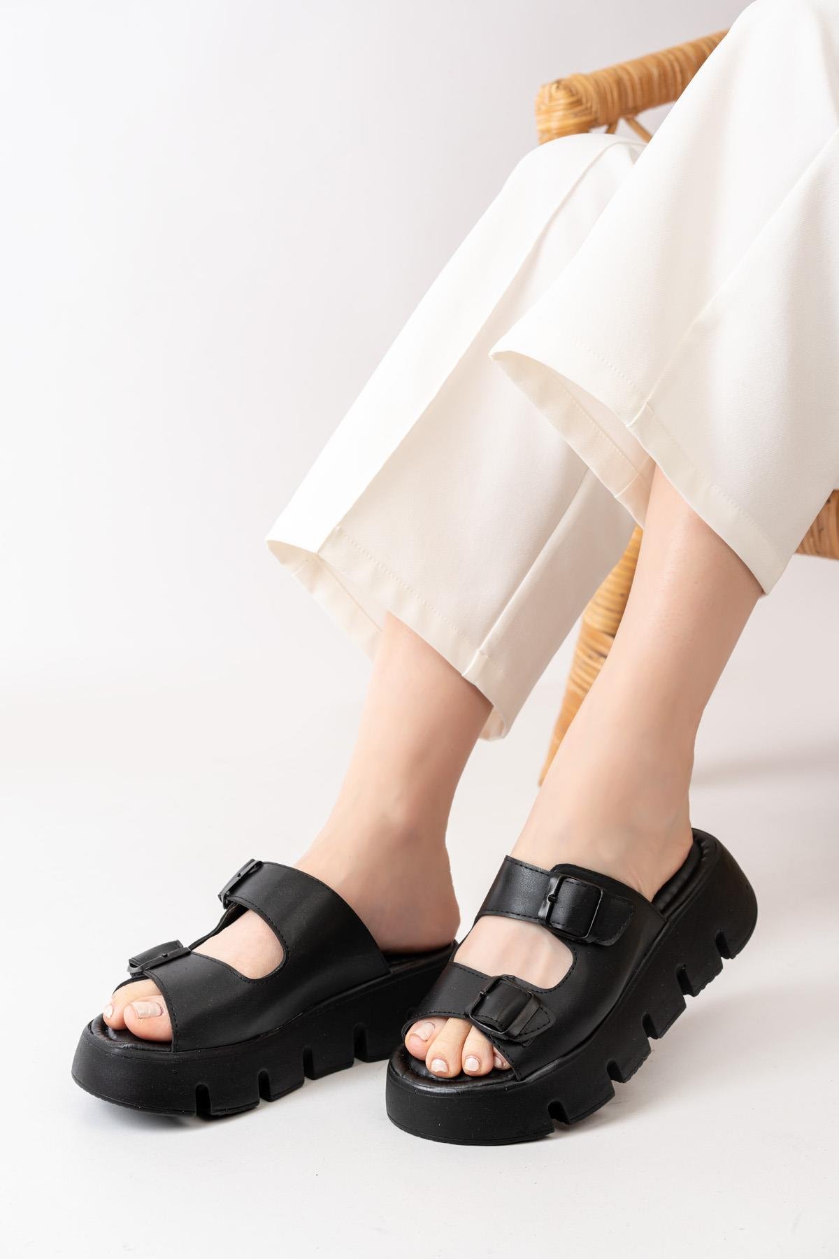Kadın Çift Bantlı Kalın Taban Ortopedik Terlik  Siyah